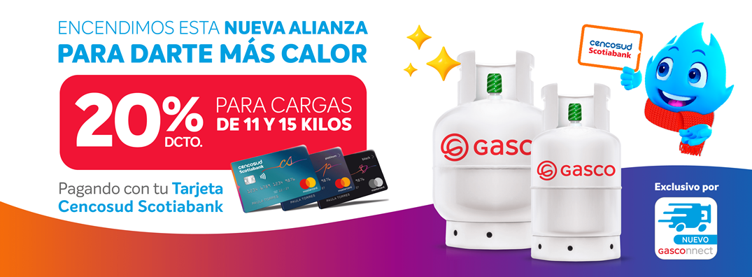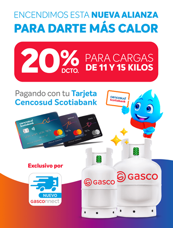 Promoción válida desde el 8/09/2025 hasta el 31/12/2025. Promoción consiste en un 20% Dcto. en Gasco válido para compras de cargas de gas de 11 y 15 Kg a través de la app Gasconnect. El beneficio se hará efectivo al momento del pago, exclusivo enrolando la Tarjeta a través de OneClick y pagando con tu Tarjeta Cencosud Scotiabank. Máximo 1 uso por cliente. Promoción no acumulable sobre otras promociones.. Promoción exclusiva clientes Cencosud Scotiabank. El pago con tarjetas de crédito puede tener costos asociados. Consulta con el emisor de la tarjeta para mayor información.