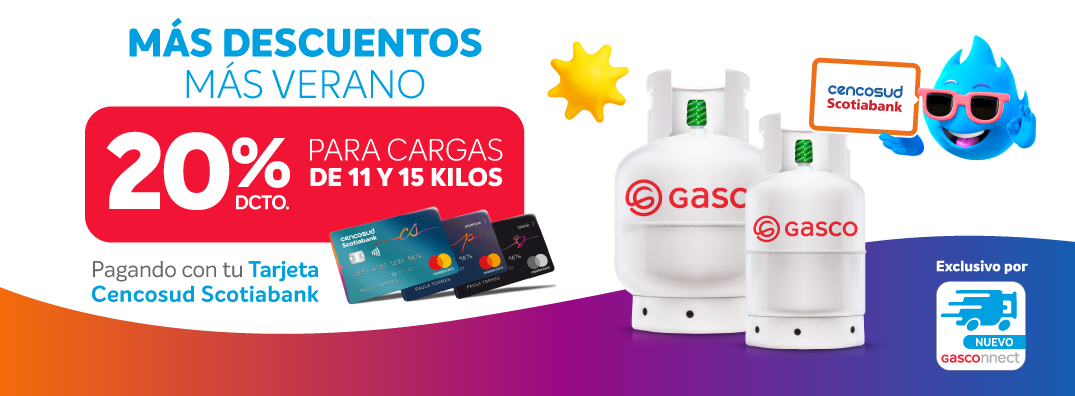 un 20% Dcto. en Gasco válido para compras de cargas de gas de 11 y 15 Kg a través de la app Gasconnect. El beneficio se hará efectivo al momento del pago, exclusivo enrolando la Tarjeta a través de OneClick y pagando con tu Tarjeta Cencosud Scotiabank.